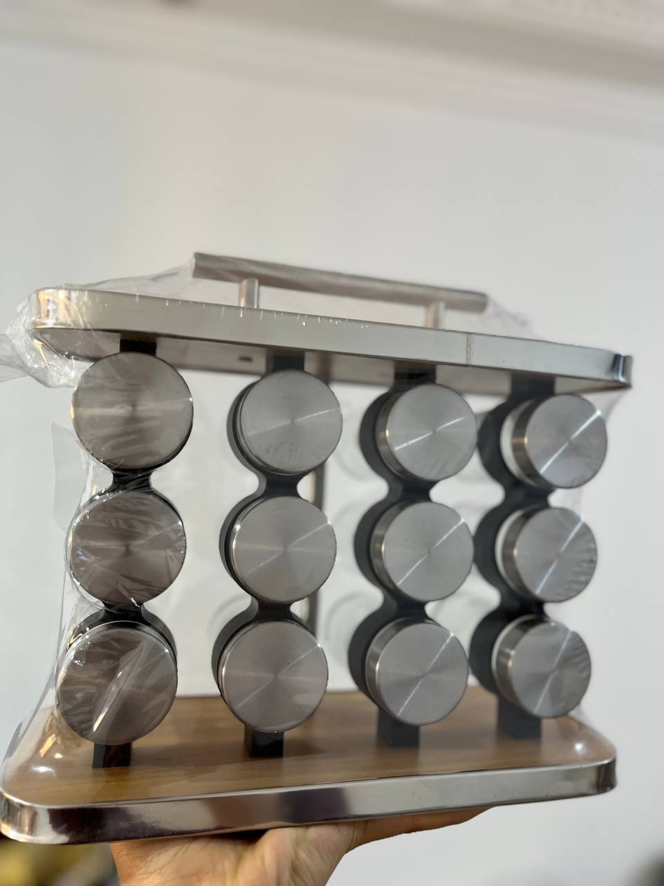 طقم بهارات مكون من 12 قطعه برطمان زجاج غطاء استالستيل +استاند مزيج بين الخشب والاستانلستيل
